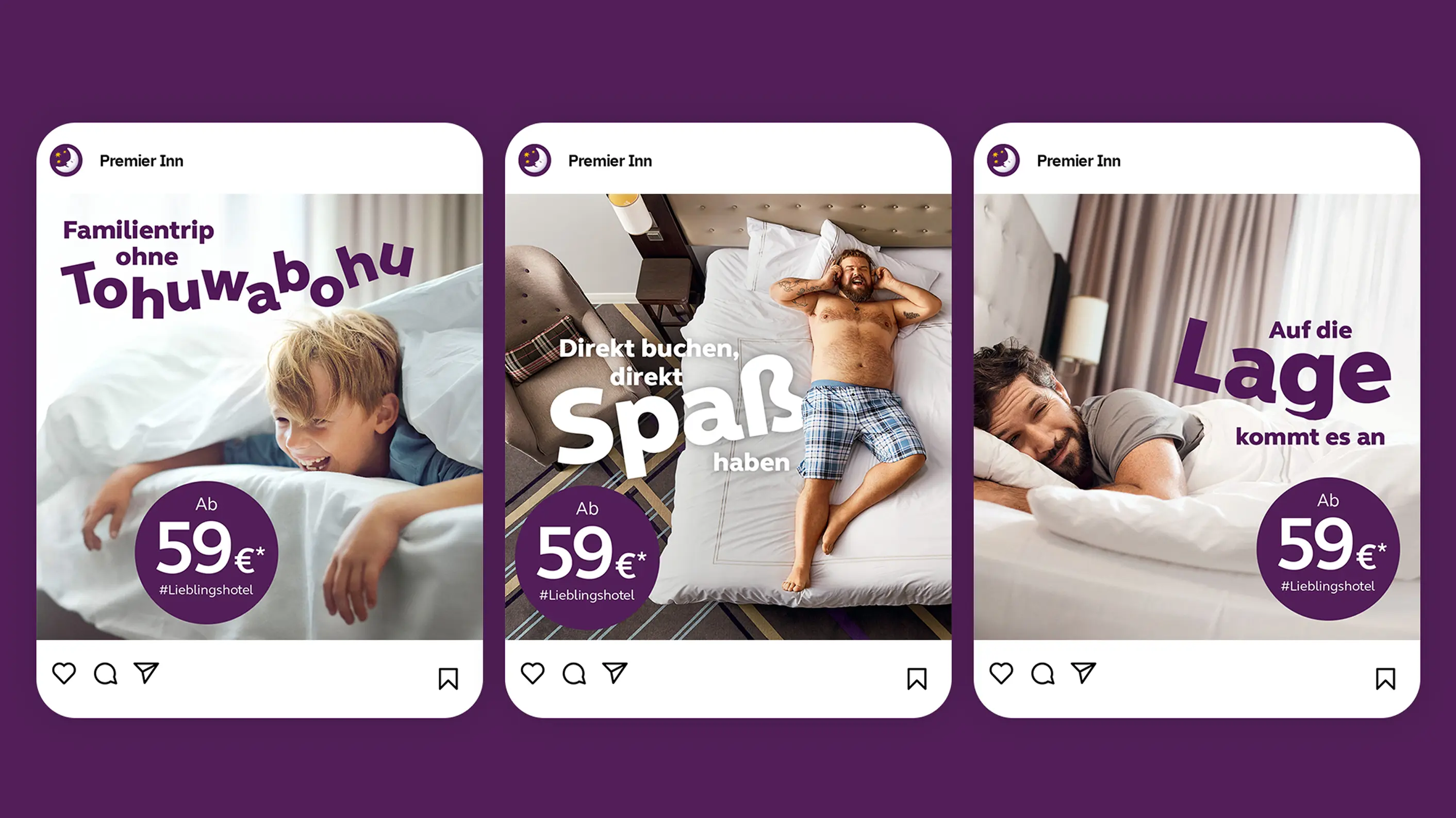 Für die britische Hotelkette Premier Inn entwickeln wir passgenaue Marketing-Maßnahmen über den gesamten Kommunikations-Funnel hinweg. Strategisch, kreativ, media-optimiert. Von Performance-Kampagnen zur Umsatzsteigerung, über Consideration-Kampagnen zur USP-Kommunikation bis hin zu SEO/SEA-Texten, um die Sichtbarkeit der Marke und damit die Brand Awareness zu erhöhen.